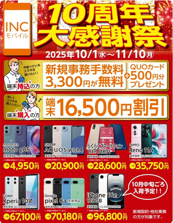 皆様にご愛顧いただきおかげさまでINCモバイル10周年を迎えました。