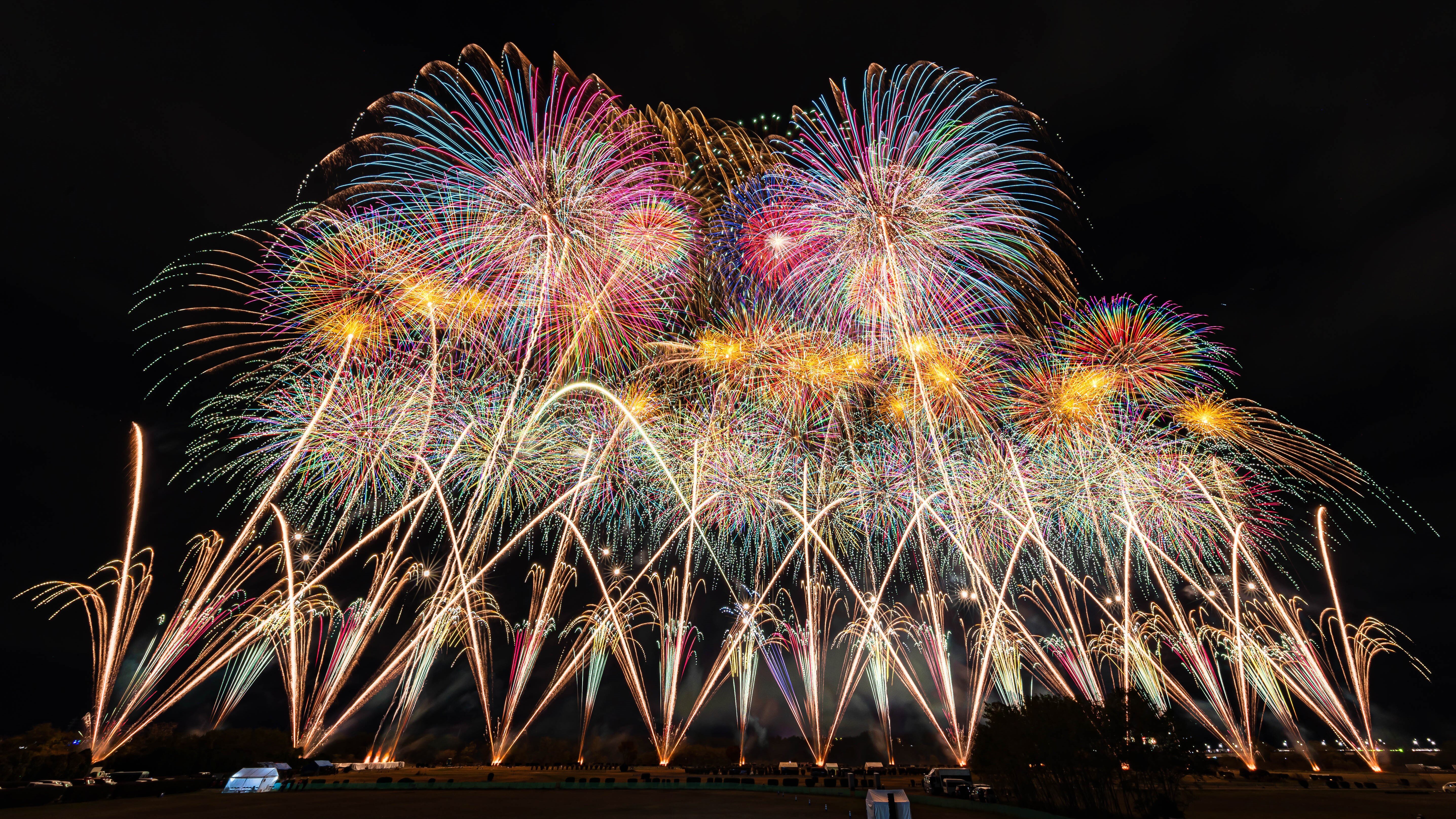 秋の澄み切った夜空を、大輪を咲かす「尺玉」や、音楽と花火のコラボ「ミュージックスターマイン」が彩ります。