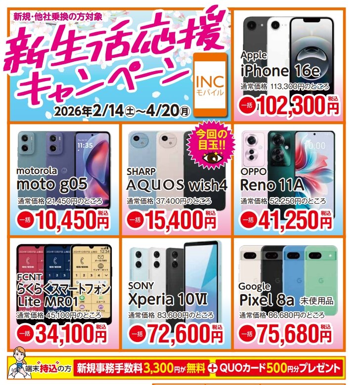 2/14~4/20 INCモバイル新生活応援キャンペーン 2026.02.14 重要なお知らせ INCモバイル新生活応援キャンペーン開催中!期間内に新規契約・他社からの乗換で、キャンペーン特価でスマホを販売いたします! キャンペーン詳細は下記リンクからご確認ください。 INCモバイル 新生活応援キャンペーン 一覧に戻る 次のページへ