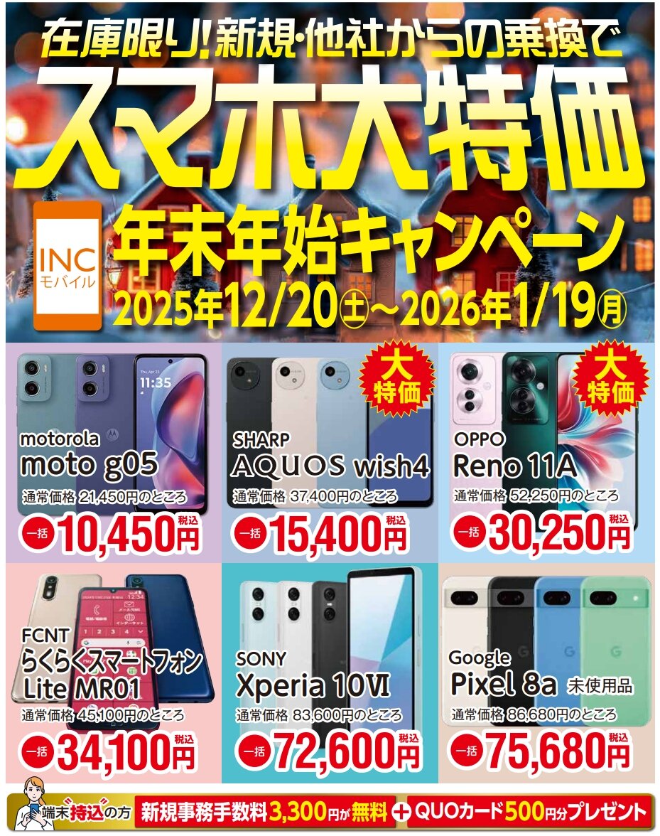 12/20 (土)~1/19 (月) INCモバイル年末年始キャンペーン開催中!