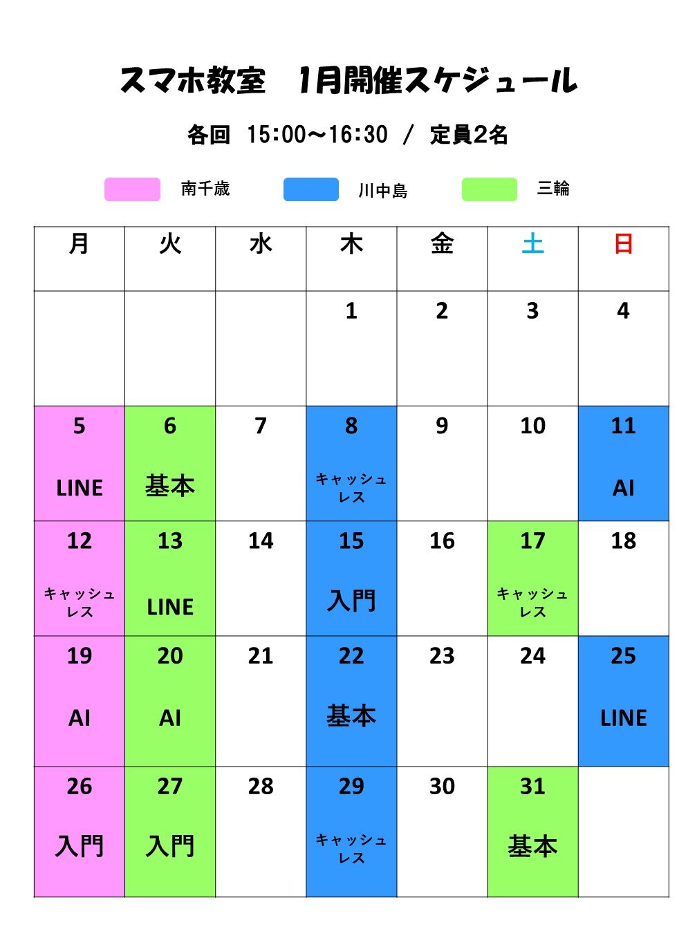 スマホ教室1月開催スケジュール 2025.12.26 お知らせ INCスマホ教室の1開催スケジュールについてお知らせいたします。スマホ初心者の方、スマホデビューを考えている方はぜひご参加ください!受講の際は、事前にお電話・店頭でのお申し込みをお願いいたします。 教室概要はこちらからご確認ください。教室概要 前のページへ 一覧に戻る 次のページへ