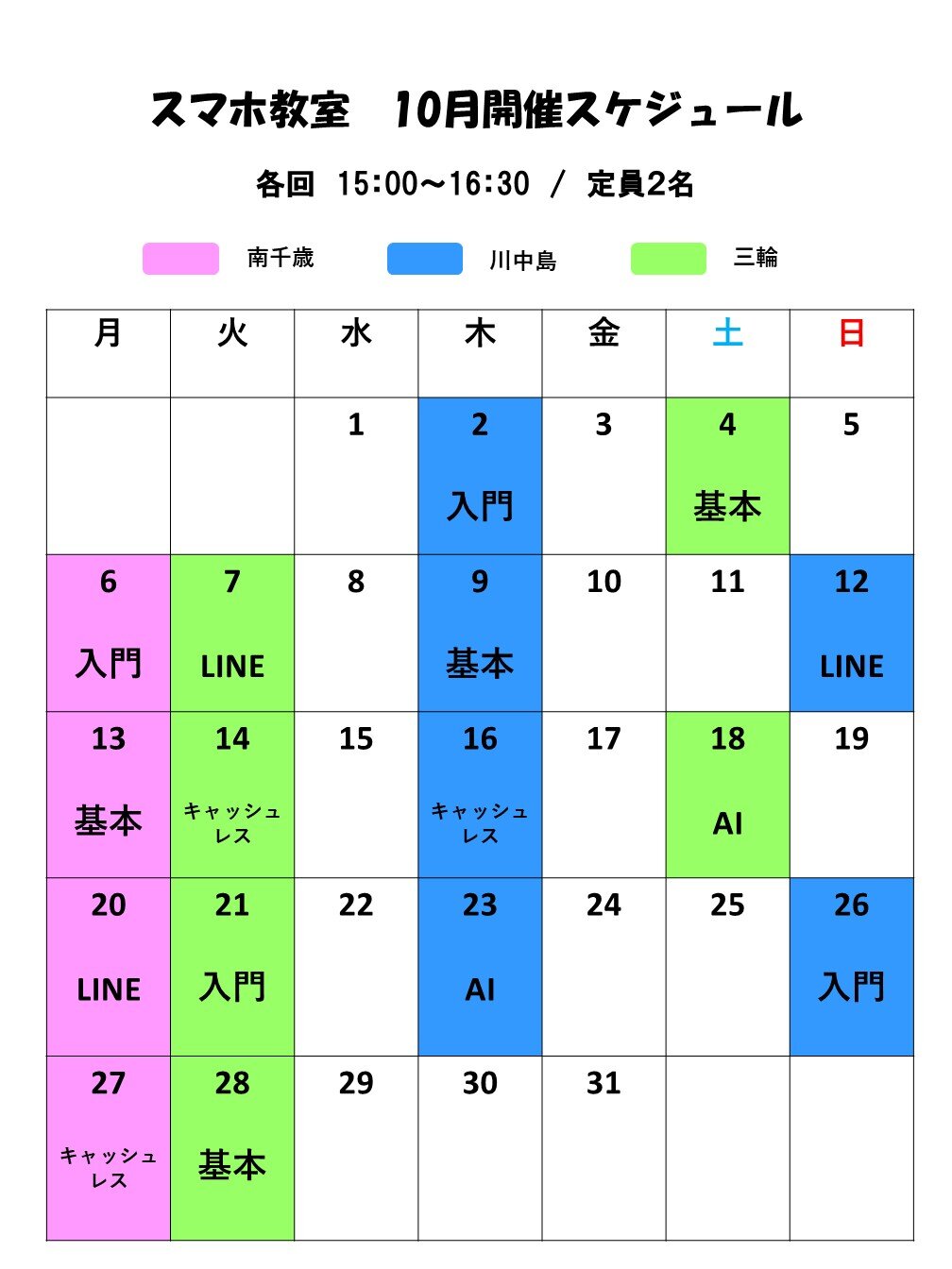 スマホ教室10月開催スケジュール 2025.09.26 お知らせ INCスマホ教室の10月開催スケジュールについてお知らせいたします。スマホ初心者の方、スマホデビューを考えている方はぜひご参加ください!受講の際は、事前にお電話・店頭でのお申し込みをお願いいたします。 教室概要はこちらからご確認ください。教室概要 前のページへ 一覧に戻る 次のページへ